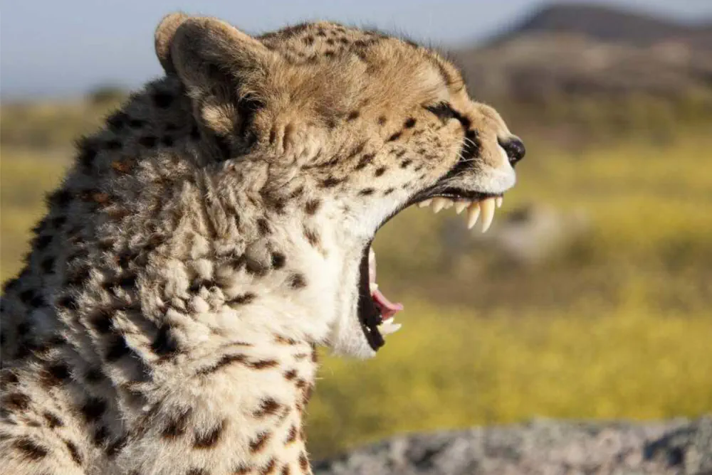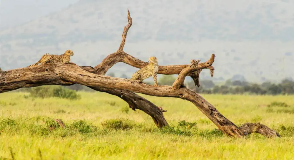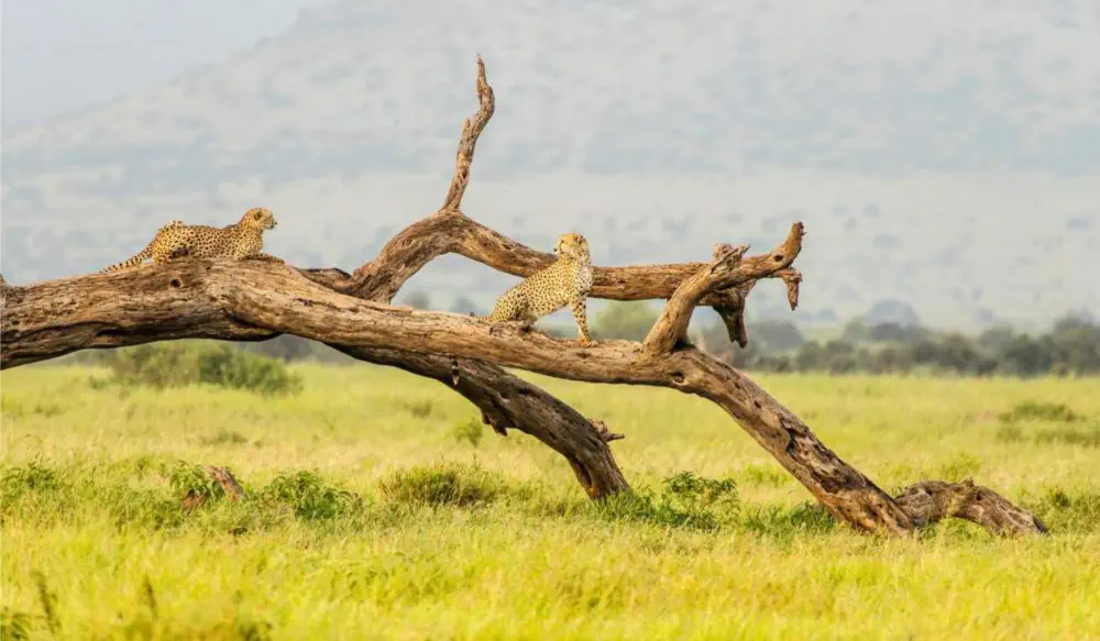 Two cheetahs sitting on a tree trunk in Amboseli National Park, Kenya