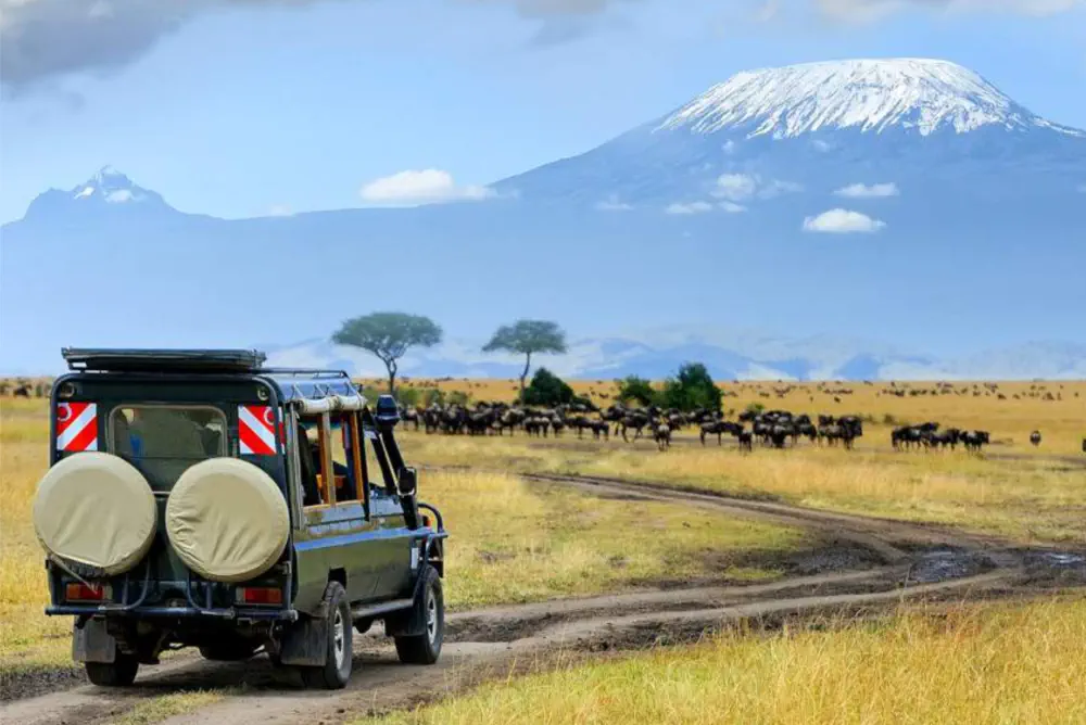 Safari vehicle in front of Mt Kilimanjaro in Amboseli National Park
